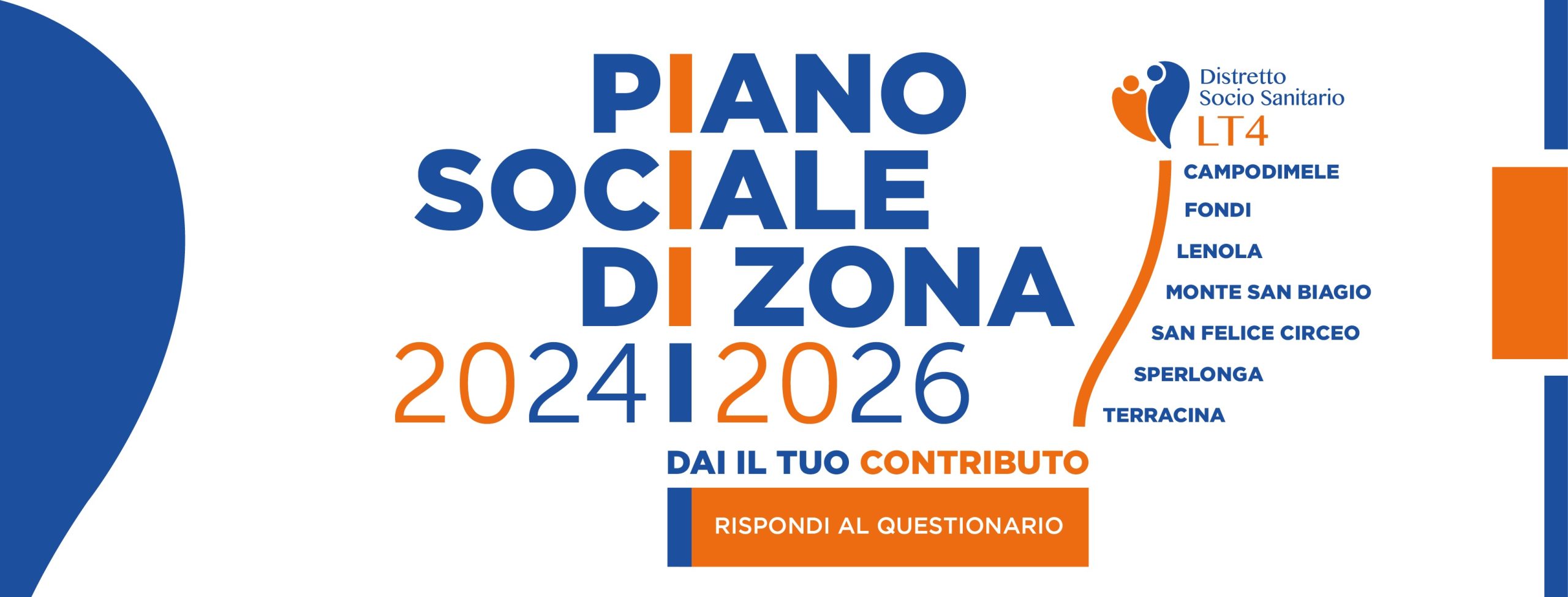 Il Distretto Socio Sanitario LT4 - che comprende i Comuni di Campodimele, Fondi, Lenola, Monte San Biagio, San Felice Circeo, Sperlonga e Terracina - sta predisponendo d'intesa con l'ASL Latina 4 il nuovo Piano Sociale di Zona (PSdZ) 2024-2026, che anche quest’anno sarà realizzato secondo le indicazioni della Deliberazione della Giunta Regionale n. 584 del 6 agosto 2020.